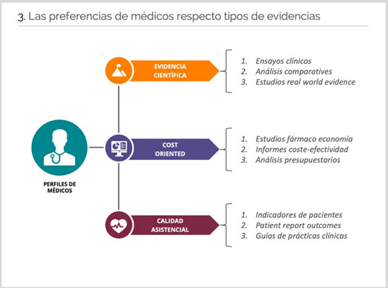 En cambio, si su enfoque está más orientado a los costes, se inclinará por estudios de fármaco economía, informes de coste-efectividad o análisis presupuestarios para asegurarse que sus decisiones de prescripción están alineados con las prioridades y penalizaciones de su centro hospitalario. Y en el supuesto caso que el perfil tenga un enfoque más próximo a la calidad asistencial, preferirá establecer un diálogo más orientado con todo aquello que le podría ayudar a conocer y mejorar la experiencia asistencial de los pacientes como, por ejemplo, indicadores de pacientes, patient report outcomes o a las guías de prácticas clínicas.