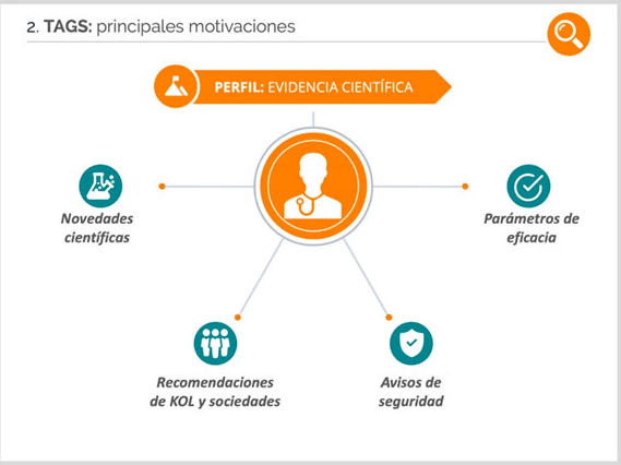 Como segundo paso, resulta vital que la industria sea capaz de definir elementos concretos (“tags”) a los que los médicos otorgan mayor importancia al tomar sus decisiones. Esto consiste en determinar, dentro de estas evidencias, los factores de máxima prioridad para el profesional que lo movilizan a la acción, como por ejemplo novedades científicas, recomendaciones de KOL y sociedades, avisos de seguridad, parámetros de eficacia, etc. En base a estos tags, los laboratorios podrán asignar mensajes más adaptados para cada uno de los perfiles médicos y, sobre todo, con la pena convicción que tendrán un impacto contundente y efectivo en ellos.