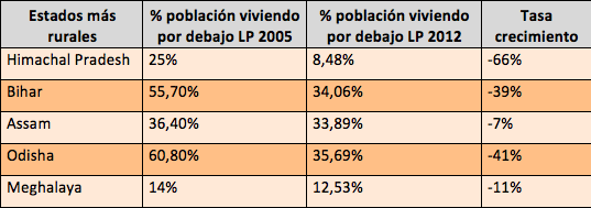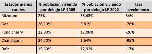El sorprendente dato de la alta inserción de India Post en la zona rural ha sido la razón por la que se ha estudiado la evolución de la pobreza en un periodo de siete años, de 2005 a 2012 [7], en los cinco estados más y menos rurales según el censo de 2011 [8].