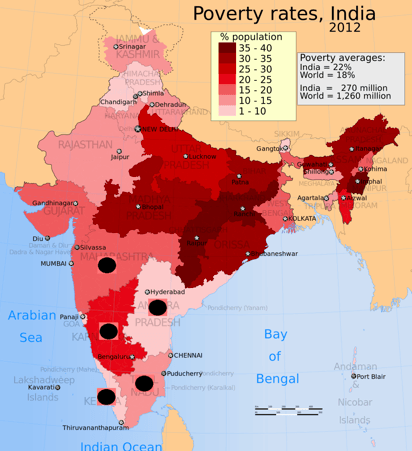 Realizando un análisis más detallado, los cinco estados con más SHGs -Andhra Pradesh, Tamil Nadu, Karnataka, Maharashtra y Kerala- se pueden ver marcados con un punto negro en el mapa que muestra los estados de la India según el nivel de pobreza [10]: