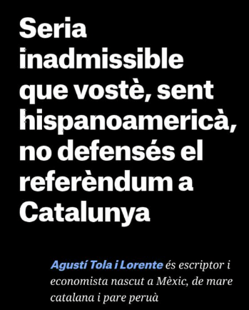 En resumen, si usted tiene sangre y antepasados de Latinoamérica, no lo olvide, no sea hipócrita y sea consciente de lo que está defendiendo y de lo que esto supone. Y no menos importante, la próxima vez que vaya a oponerse al referéndum, piénseselo dos veces. No lo haga por Cataluña –un país que le ha recibido y tratado como un ciudadano catalán más– sino hágalo por sus orígenes; por todos esos familiares que lucharon, murieron e hicieron posible la independencia de vuestros respectivos países.