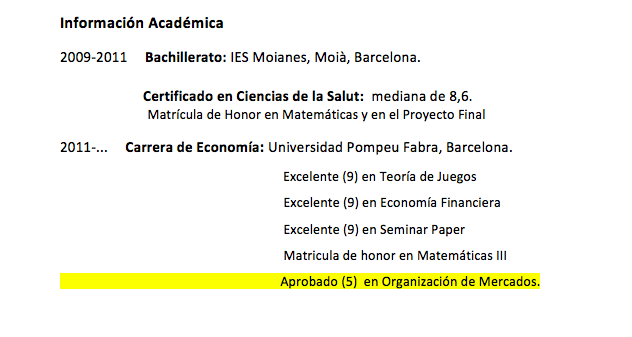 Al final, antes de dar por cerrada la entrevista, me dijo: “Señor Agustín, me gustaría preguntarle una cosa que observé en su CV y no entendí. Creo que fue un error tipográfico. ¿Por qué destaca el hecho que sacó un 5 en una asignatura determinada en la universidad?”. Girando mi papel me señaló con su dedo, que parecía acabado de salir de la manicura, la siguiente línea (en color amarillo):